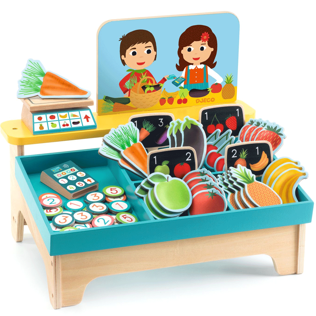 Djeco kleine markt kraam Groente- en fruitkraam om te doen alsof er gekocht of verkocht wordt. Iedereen heeft zijn eigen rol! De verkoper stalt het eten mooi uit in zijn kraam, doet alsof hij het weegt op de weegschaal, berekent de kosten en bedient de kassa. Klanten doen hun boodschappen zoals ze willen of volgens hun boodschappenlijstje en gaan vervolgens naar de kassa om te betalen met munten of een creditcard.